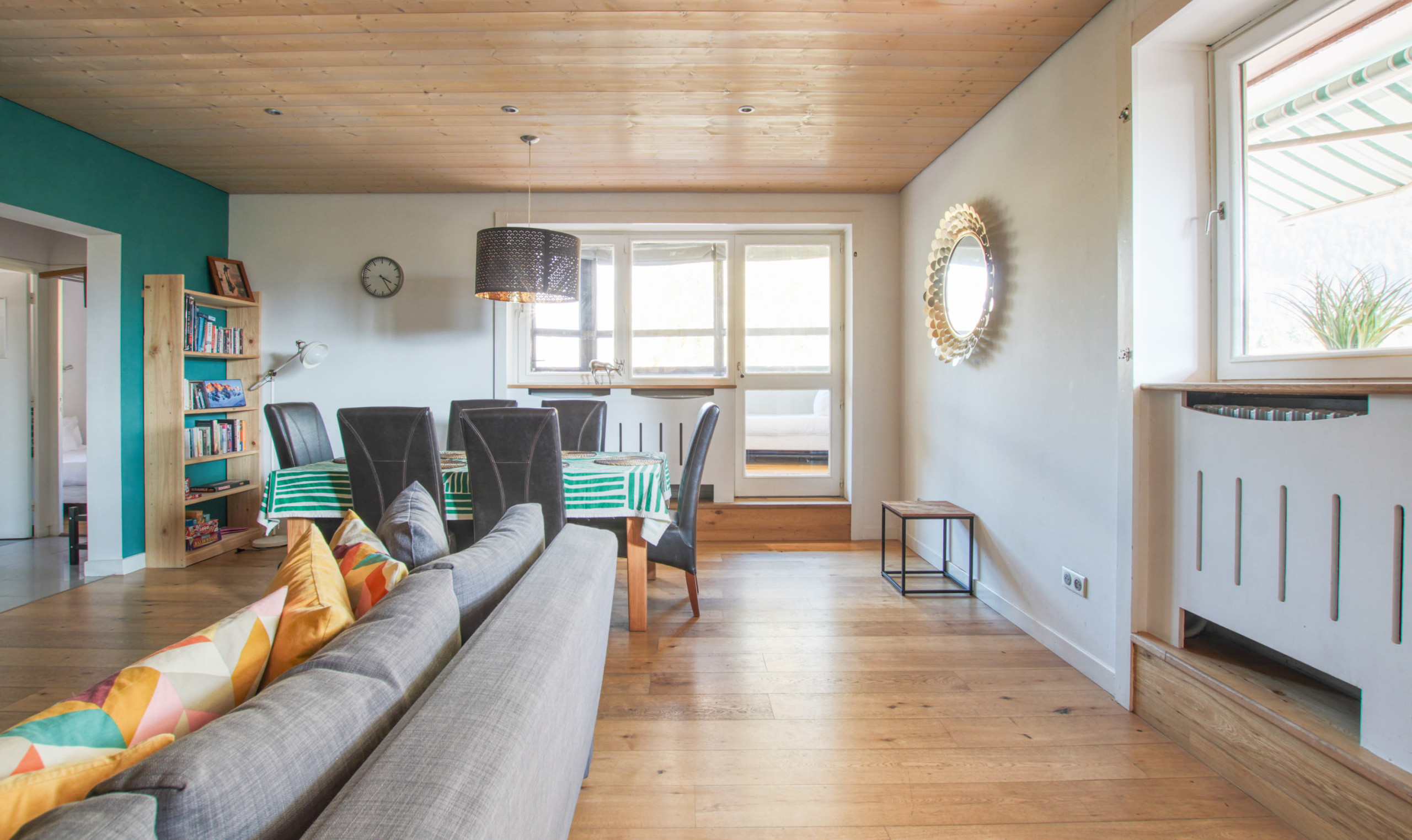 Immense salon avec sol en bois, table à manger, canapé-lit confortable, télévision et poêle à bois avec four à pizza intégré - parfait pour des soirées chaleureuses après des aventures en montagne. Cuisine indépendante entièrement équipée avec plaque à induction. Les deux chambres peuvent être configurées en lits jumeaux ou doubles selon votre groupe. Deux canapés-lits supplémentaires dans l'espace de vie portent la capacité totale à 6 invités. Salle de bain avec baignoire de taille standard et douche. Cette immense terrasse privée sur le toit offrant une intimité totale - aucun bâtiment voisin ne surplombe votre espace.