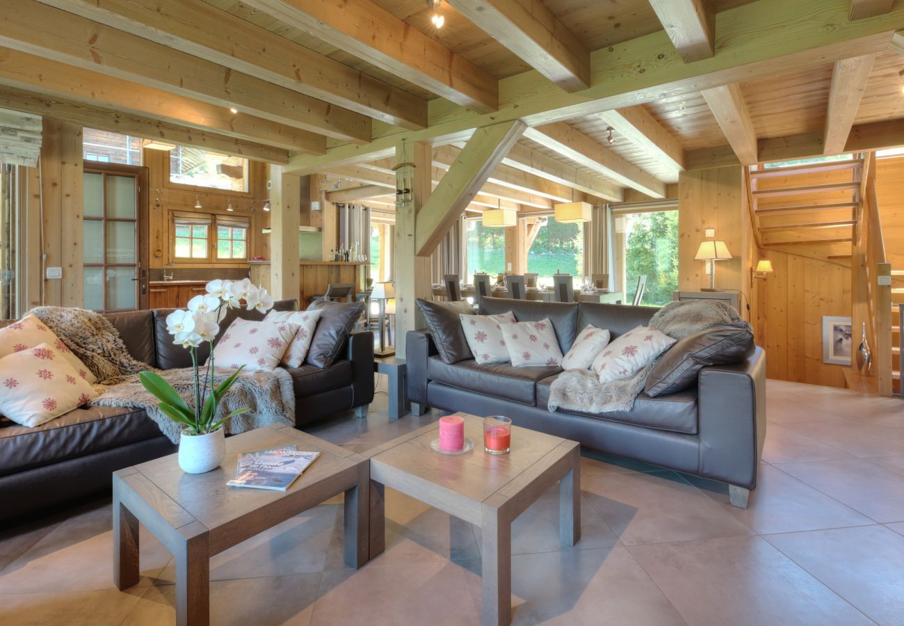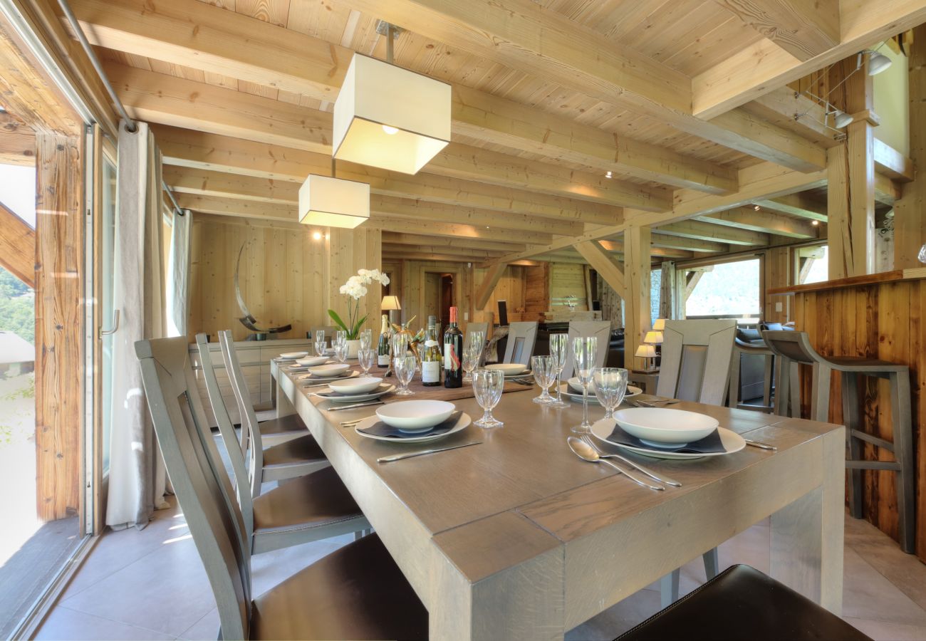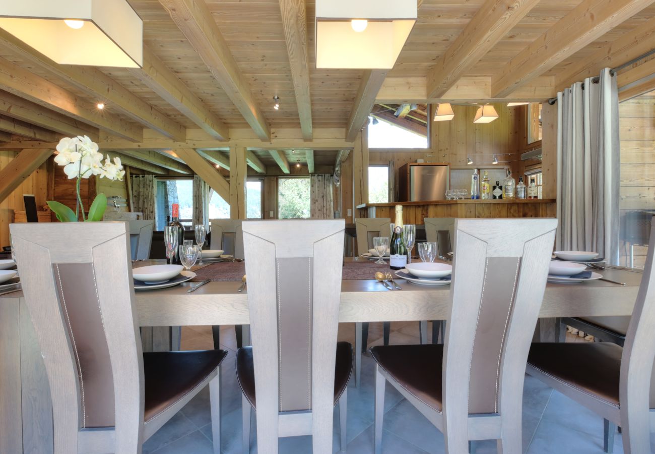 Ce chalet de 350 m² propose 4 chambres doubles/twin et 1 grande chambre avec lits superposés, des espaces de vie ouverts très vastes avec une cheminée centrale, une cuisine très grande et ouverte, parfaitement conçue pour des soirées conviviales avec traiteur, un spa avec sauna et hammam, une mezzanine avec espace média et détente, de très grandes terrasses avec un jacuzzi 7 places, des vues panoramiques sur toute la Vallée de Chamonix, l'ensemble du Massif du Mont Blanc et la belle chaîne des Fiz.