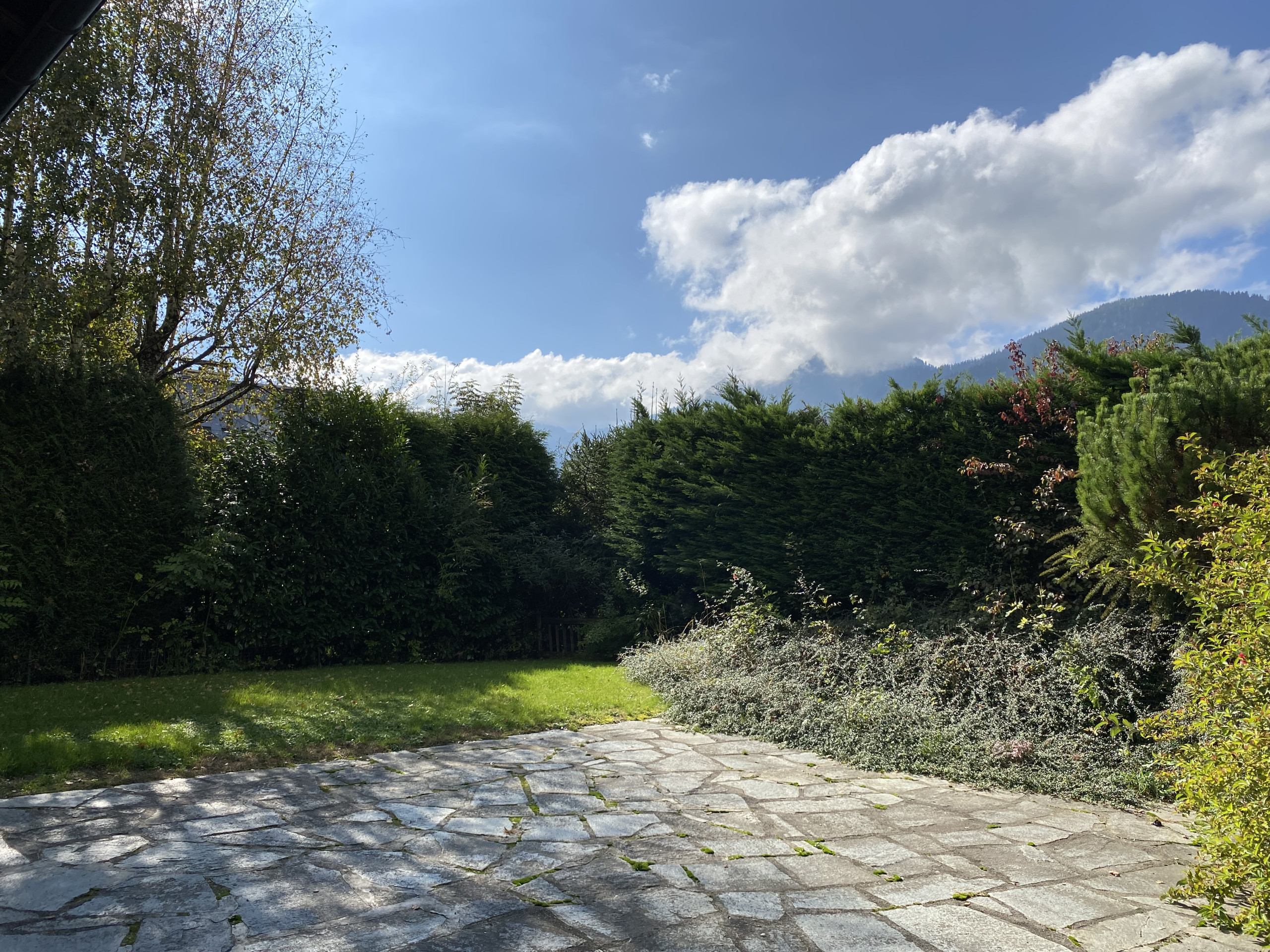 Jardin et terrasse privés avec mobilier de jardin, parfaits pour profiter d'une vue imprenable sur les montagnes.