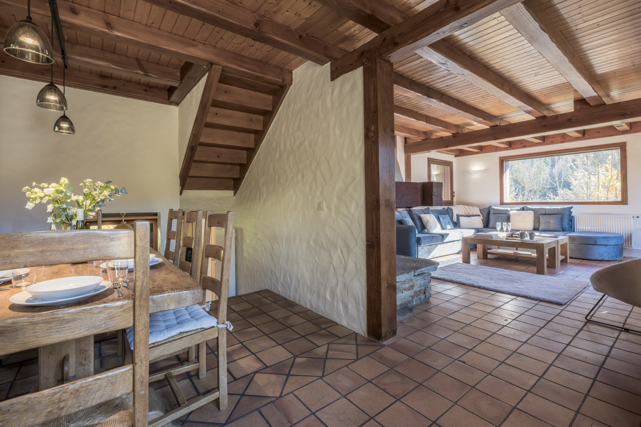 Vaste espace de vie ouvert comprenant salon et salle à manger, au charme alpin traditionnel.