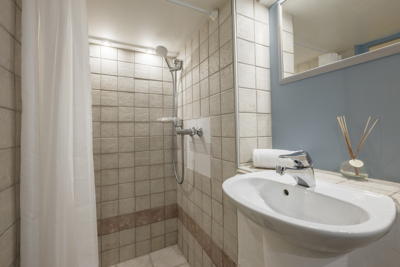 Chambre 1 : lit king-size et canapé-lit deux places, salle d'eau attenante avec douche, lavabo et WC.