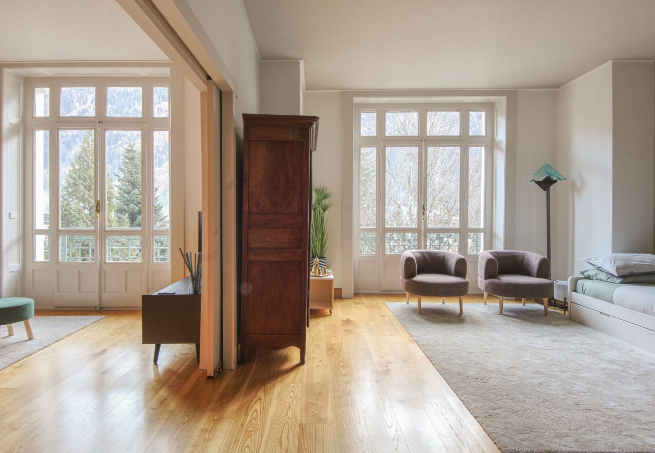 A stylish two-bedroom apartment with in the historic Majestic building in the centre of Chamonix town that sleeps up to eight people in two bedrooms.